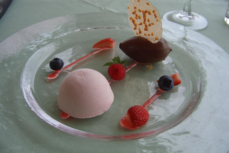 5月8日 前日・7日に京都・祇園での友人(河波忠兵衛君・京都商工会議所青年部会長)を励ます会に参加して、翌8日に妻(綾子)と合流、銀閣寺(金閣寺ではありません・ピカピカで無い方です)そして比叡山・延暦寺に行きました。延暦寺では大きな梵鐘が吊られていて、「連打禁止・1回50円」と書かれていて、私も思わず打ってみました。すこぶる快感でしたヨ。さしずめ自分の人生に鐘を鳴らしたみたいな気分でした。広大な比叡山にはさまざまな寺社が建てられていて、日本の仏教の元祖の集大成を感じさせましたが、国宝・根本中堂入り口の掲示板に書かれていた言葉(写真参照)に、心が洗われるようでした。人は自分の人生(仕事や家庭など)に最善を尽くすことで社会全体を輝かすことができるという教えです。私と妻も、当蔵の日本酒を通じて、皆様の人生を少しでも輝かせることが出来るよう最善を尽くすことをお誓い申し上げました。帰りに、フレンチレストランとして話題の、ロテル・ド・比叡というホテルのレストランで食事致しました。比叡山の中腹にあり、琵琶湖から京都まで見渡せる眺望も素晴らしく、料理は、グリル料理はガラスの皿まで熱く熱してあるなど、きめ細やかなフレンチでした。写真はデザートです。私達2人は、2種類のコース料理を頼んで、途中で取り替えしたり、食べあいっこしながらの会食で、素敵で静かなカップルばかりのなかで、ちょっと場違いな中年の2人でしたが、お店のスタッフは、にこにこしながら感じの良い対応をして頂きました。うわさどおりの素晴らしい眺め・おいしい料理でした。